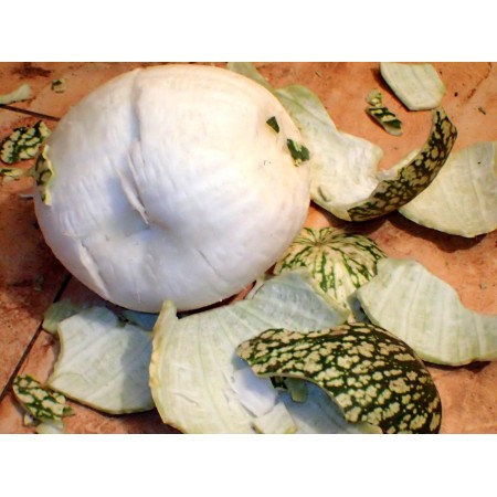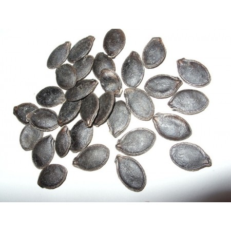 This mountainous, tropical, perennial herbaceous vine produces nearly round, green and white speckled (similar to a watermelon in appearance) or solid white, medium-sized (5-6 kg = 11-13 lbs) fruit. It is a perennial vine adapted to the temperate climate of the American mountains (from Chile to California). The plant is also cultivated in the tropics, for example, in the Philippines and India (one of its names is "Malabar pumpkin," suggesting Indian origins—which is false, as all pumpkins originate from the New World). In Europe, some people know it because cucumbers were grafted onto it (they produce better and faster fruiting and are more disease-resistant). There are many cultivated varieties of this plant. This variety has green, white-mottled, and striped skin, snow-white flesh, and black seeds, and blooms year-round (even during long days). Unfortunately, I don't know its name. Black-seed pumpkin fruit can be used similarly to other pumpkins – unripe ones are cooked like zucchini, while ripe ones are marinated in vinegar with sugar, cloves, and cinnamon (prepared this way, they have the consistency of unripe coconut because the flesh doesn't soften after cooking). The seeds, flowers, and young shoots are also edible. The plant also has medicinal properties – it lowers blood sugar levels. The variety mentioned above grew very well in our garden. It began flowering and fruiting early, producing a bountiful harvest (usually 2-5 fruits per plant). The fruits are about 20 cm long. Their shape is almost round or oval – slightly longer than wide. In our climate, it is not considered a perennial because it is frost-tolerant. Seeds can be sown outdoors in early May. The fruit can be stored for a very long time (even over two years at room temperature), and it is possible that seeds extracted in May from fruit harvested the previous autumn are not yet ripe and do not germinate. Fully developed seeds are usually uniformly black. As the name suggests, the leaves of this pumpkin resemble those of the fig tree (Ficus carica). The plant is resistant to most diseases and pests, such as fusarium wilt (which is why cucumbers are grafted onto it, and in Asia, melons are also grafted onto it). It is possible (even for an "ordinary Szymanski" – this does not require a skilled grower) to grow a hybrid of the fig-leafed pumpkin (Cucurbita ficifolia) and the giant pumpkin (C. maxima). Simply pollinate the flower of the former with the pollen of the latter (and ensure that a net is placed before and after pollination to prevent insect pollination). This is not always successful – it depends on the varieties being crossed. However, sometimes, after such controlled pollination, fruit is produced, containing fertile seeds. These seeds produce F1 hybrids with intermediate characteristics and highly decorative fruit—yellow-orange (sometimes partially green) and white speckles. This species also hybridizes with the frost-resistant pumpkin (Cucurbita foetidissima) - we also sell seeds of this hybrid (look for another offer of this hybrid in the store). The pack of 12 fresh seeds is available for sale.