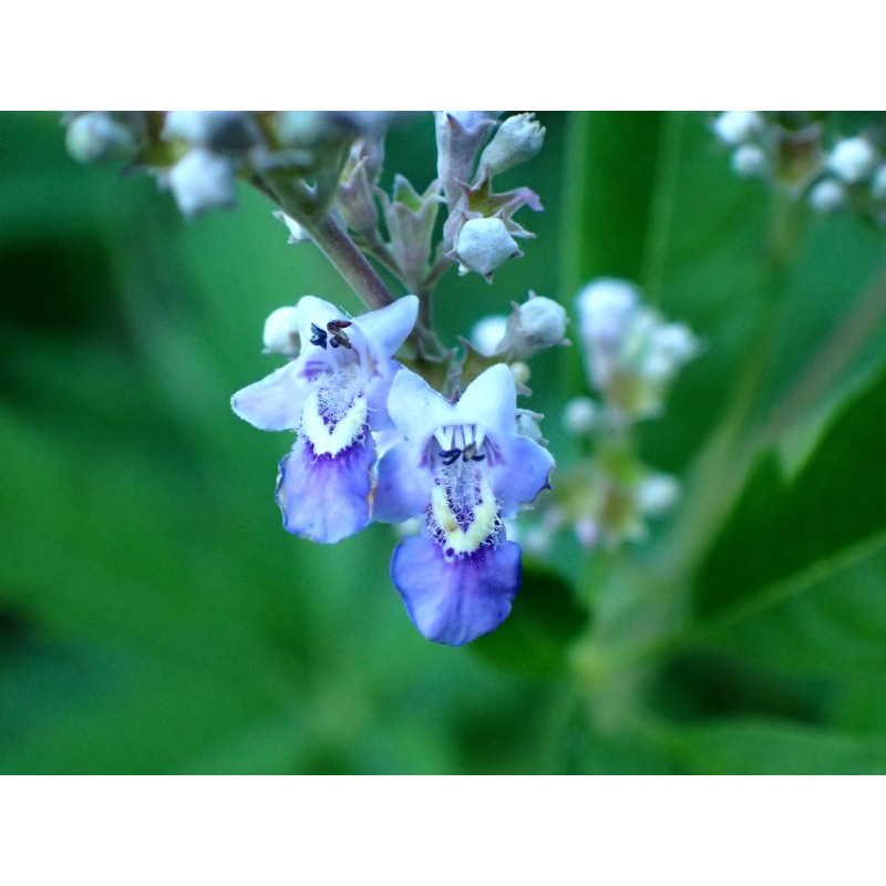 A shrub native to Asia (China and India). It is the most frost-resistant species of the Vitex genus. It overwinters easily in our garden in zones 6/7. Highly aromatic. The fragrant leaves are brewed into a delicious tea, and the fruit is used as a spice. It is very ornamental (blooms in late summer) and highly melliferous. Very difficult to find in trading in Europe. A packet of 20 seeds is available (undried, stored moist for optimal viability). Seeds can be sown on a windowsill immediately after receiving them, or stored in a moist substrate in the refrigerator until spring, then sown. Only a few packets are available.