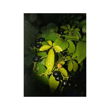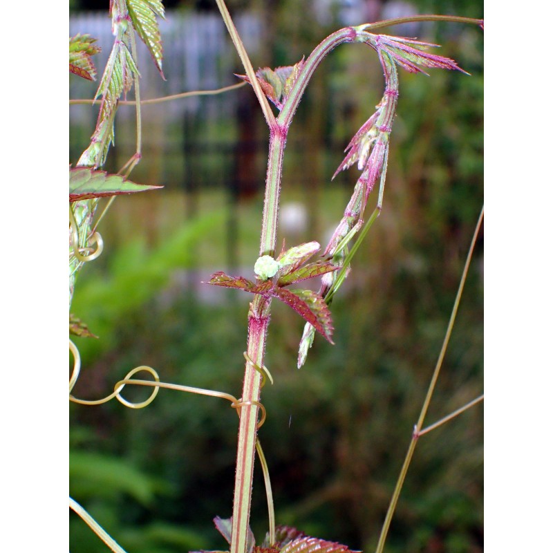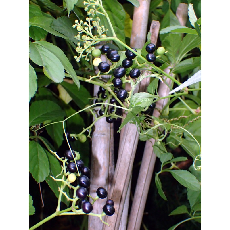 This herbaceous, relatively tall, perennial climber is quite frost-resistant (it overwinters well in our garden in zones 6/7 under cover). It is very expansive and can kill nearby plants (hence the English name "bushkiller"). Young shoots are edible when cooked and very tasty. The black berries are also said to be edible and are used for preserves (although we find them tart). It is a rare commercial plant in Europe. Seeds should be sown in autumn in a cool cellar or stratified in moist sand in the refrigerator. They germinate in spring. Packet of 25 fresh seeds.