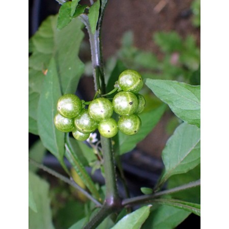This is a vegetable variety of the nigtshade species (S. nodiflorum), traditionally used as fruit and vegetale plant in Mexico. Young shoots and leaves are boiled in two or three times changed waters and eaten similarly to spinach. This variety is smaller than Filipino one (look at other our offer) but creates much more fruits - it is more fruity variety (less spinach) Not every other Solanum nodiflorum variety is edible. The fruits are often eaten as a snack when fully ripe. They are small but extremely sweet. Once ripe, they fall to the ground. This variety is very rarely found in the trade. We obtained it many years ago from the Mexico and are striving to preserve and propagate it, as it has very valuable characteristics. The seeds should be sown very shallowly. Grow like tomatoes. Package of 20 fresh seeds (harvested in the fall of 2025).