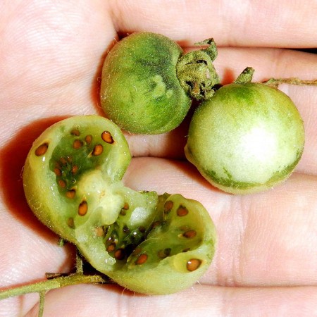 The rare fruit – it is sprawling perennial shrubs or vines to 6 m (20= ft) long, but usually smaller. Flowers very showy 2,5-5cm (=1-2 inch) diameter, golden. The fruits are edible (in Ecuador they are pickled with onion). Fruits are small (about 1-1,5cm = 0,4-0,6 inch) diameter, green, hairy (with very fragile straight hairs), fragrant and very delicious when fully ripe (with specific fruity aroma and taste). Leaves with glabrescent upper surfaces. Species native to the southwestern parts of Ecuador at lower latitudes (0-6 degrees south). This form is capable of crossing with common tomato (Solanum lycopersicon). Plant resistant to powdery mildews, early blight, bacterial speck, root-knot nematodes and two species of red spider mite. Late but earlier than the second form - Lycopersicon hirsutum f. typicum (- available in other our offer). Resistant to low temperatures. Package 25 seeds (harvested from our garden)
