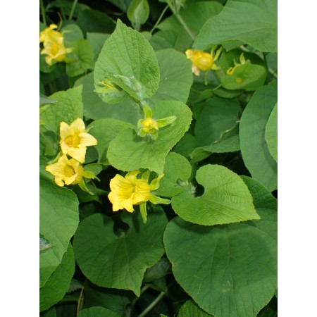 The perennial climber to 6m (20 ft) long. Frost hardy to zone 6a. This plant creates round tubers (similar to potatoes but edible probably after processing) and tasty, red fruits (which resemble Passion Fruit inside) which are considered as edible when fully ripe. In my experience I can say that fruits are very delicious, aromatic and very sweet, but edible in raw state only in small amounts (because they irritate throat during eating - probably contain calcium oxalate raphides). But long boiled flesh of fruits loses irritating qualities and is very delicious even in large doses. Very ornamental climber - numerous yellow flowers and red fruits. Seeds fresh - harvested in autumn 2024. Seeds hard to find in trading. Very rare plant. Sow the seeds surface. Keem moist but not very wet. You can use fungicide to covering the seeds. To creation of fruits there are necessary male and female plants (from the seeds there should grow up both sexes) and hand pollinating (because it creates in its flowers fat oil, not nectar, and European or American bees do not want pollinate them). Package 25 seeds (harvested in autumn 2024). Warning: this species has been reported as a rare (but locally very abundantly growing) invasive plant in some countries, for example in the upper Midwest of the United States.