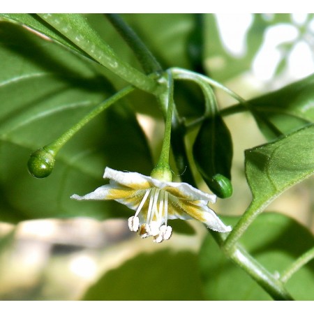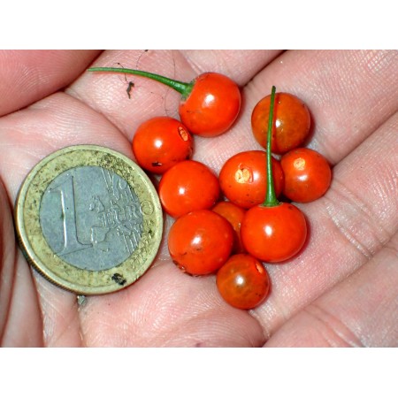 Hardy Chili (Capsicum flexuosum) is a deciduous shrub about 1-3 m (=3-10 ft) tall that produces mildly spicy (in the case of my plants, they are actually quite spicy), very sweet-tasting, small (about 7-10 mm), round, red fruits and black seeds. This very rare species of wild pepper is native to southern Brazil and the extreme northern part of neighboring Argentina and eastern Paraguay. It is incredibly cold and frost hardy - down to about 5-14 degrees F [= (-10)-(-15) degrees C] or even less under preferred conditions. Perhaps this shrub can also be grown in an open garden in Poland, thickly mulched - the above-ground part will freeze, but it should spring back from the roots (there is a caveat, however - if someone would like to try this, we do not guarantee success and we recommend planting a large plant in the garden in spring, one that has already overwintered at least one winter, e.g. in a cellar, so that it has time to settle in well and grow until autumn. We also advise thickly mulching the area around it, about 1-2 square meters. In our country, these peppers overwinter in an unheated greenhouse, with the roots covered with agrotextile and a mound of soil. This plant is very difficult to propagate from seeds. It is best to use the hormone - gibberellic acid - GA3 (2000 ppm for 24 hours) + chamomile tea to soak the seeds before sowing (or cover the seeds with a chemical fungicide instead of chamomile). The seeds germinate slowly and irregularly (sometimes after a few months from the sowing date). They should be sown very shallowly in well-drained, light soil and maintained at constant humidity (e.g., cover the pot with a clear foil) and warmth (you can place the pots on a radiator until sprouts appear if it's cold in the house; then place them on a windowsill). And you have to be patient. Small seedlings are very, very susceptible to fungal diseases. Larger plants (over about 10-12 cm = 4-5 inches tall) are much more resistant. Later, it is a very easy plant to grow. Once established, it is drought-resistant but prefers well-drained soil. A "cactus mix" is best for it if the plants are grown in pots. They should be fertilized regularly. The plant can also be easily propagated vegetatively through semi-hardwood, green cuttings (preferably with a "heel"), which root easily in pots. A sunny windowsill (in a mixture of large amounts of sand and peat soil – approximately 1:1). The literature often describes this species as self-incompatible, so at least two genetically different plants are needed to produce fruit. However, I've noticed that a single plant can occasionally produce fruit without pollination from another plant, both outdoors and indoors (including without bee pollination). However, to harvest a good harvest, at least two genetically different plants (developed from two seeds) and insects (pollinators) are needed. In this case, the plant produces very numerous fruits. This plant is sometimes used for crossbreeding with other chili peppers. It possesses valuable "frost-resistant" genes. The chromosome number of C. flexuosum is the same as that of cultivated chili pepper species (2n = 24). Perhaps in the future, its genes will produce frost-resistant, large-fruited chili peppers? A rarity. A pack of 30 fresh seeds. Seeds harvested in the fall of 2025 yr. and stored under appropriate conditions.