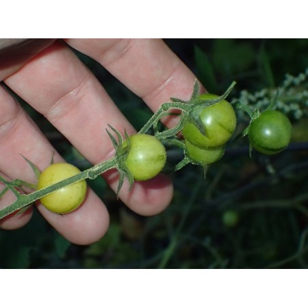 This variety was developed through further breeding, from a hybrid we created of three other wild tomato species and a wild form of the cultivated tomato (four species in total). We don't know the stability of this hybrid. The plant is self-incompatible, so at least two plants (from two seeds) are required for fruiting. The fruit of this variety is approximately 1.5 cm (0.6 inch) in size. They are yellow and have a very unique flavor—completely different from known tomato varieties and truly DELICIOUS. 'Blond Smurfina' has only 12.5% genes derived from the cultivated tomato (Solanum lycopersicon). Besides its unique flavor, our hybrid also possesses other remarkable traits inherited from the wild species, such as the presence of flower buds in the inflorescence and resistance to many diseases, including potato blight (we don't know how these traits will persist in subsequent generations). Here we offer seeds that will produce F2 generation plants. The photos show F1 plants—those that produced F2 seeds. Creating this variety took a lot of work. It's worth trying the fruit—the taste is truly indescribable, unique, and delicious (and different than other our varieties - for example 'Smart Blondie' and 'Braliant Idiot'). If you're passionate about growing unusual tomato varieties, you've come to the right place. This is our new creation—we're the only sellers of this variety. The package contains 12 fresh seeds.