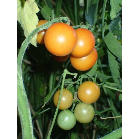 This variety was created by crossing a hybrid of a cultivated tomato with Solanum habrochaites and a hybrid we created of two other wild tomato species. We don't know the stability of this hybrid. The plant is self-compatible, so a single plant is sufficient for fruiting. The fruit of this variety is approximately 2.5 cm (1 inch) in size. They have a unique, amber-orange color, are hairy, and have a distinctive flavor—different from commonly cultivated tomato varieties. 'Adolf' has approximately 45% of its genes derived from the cultivated tomato. We offer seeds here that will produce F2 generation plants. The photos show F1 plants—those that produced F2 seeds. The F1 plants were fully resistant to potato blight. Whether this trait will persist in subsequent generations is unknown. Creating this variety took us a lot of work and time. It's worth trying this variety, as it has a unique flavor. If you're passionate about growing unique tomato varieties, you've come to the right place. This is our new creation—we're the only sellers of this variety. Each package contains 7 fresh seeds.