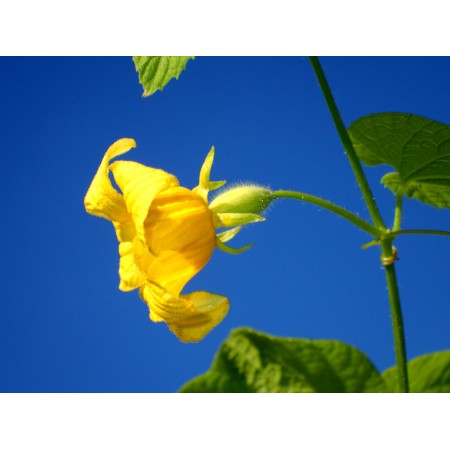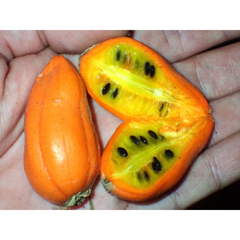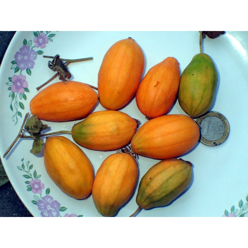 Bardzo silne, wieloletnie pnącze hybrydowe, odporne na mróz do strefy co najmniej 6. Jest to hybryda stworzona przez nas ze skrzyżowania ziemniaczki sercowatej (Thaladiantha dubia) z innym gatunkiem ziemniaczki (Thaladiantha sp.). Różni się od dość powszechnego w ogrodach pierwszego gatunku pomarańczowymi (nie czerwonymi) owocami i delikatnymi białymi plamkami na liściach oraz kilkoma innymi szczegółami botanicznymi. Owoce wydają się być jadalne po osiągnięciu pełnej dojrzałości, a w pokoleniu BC1 spotkaliśmy okazy bez palącego smaku (który jest charakterystyczny dla Th. dubia) – nadają się do spożycia na surowo (a więc są bardzo cenne). Jednak nie wszystkie rośliny posiadają tę cechę. W pokoleniu BC1 obserwuje się rozdzielenie genów i cech, ale dzięki temu możliwe jest selekcjonowanie wartościowych roślin i rozmnażanie ich wegetatywnie jako nowych odmian, np. owocowych. Owoce naszej hybrydy są bardzo smaczne, aromatyczne i bardzo słodkie, ale niektóre siewki mają smak piekący, a inne nie. Nawet "palące" owoce nadają się do spożycia – długo gotowany miąższ traci drażniące właściwości i jest bardzo smaczny. Bardzo ozdobne pnącze – liczne żółte kwiaty i pomarańczowe owoce o pomarańczowym lub żółtym miąższu. Nasiona świeże – zbiór jesienią 2024 roku. Trudno dostępne w handlu. Bardzo rzadka roślina – jesteśmy hodowcami tego mieszańca i jedynymi sprzedawcami. Wysiewać nasiona powierzchniowo. Utrzymywać wilgotne, ale niezbyt mokre podłoże. Można pokryć nasiona fungicydem. Kiełkują bez zabiegów przedsiewnych. Do zawiązania owoców niezbędne są rośliny męskie i żeńskie (z nasion powinny wyrosnąć osobniki obu płci) oraz ręczne zapylenie (ponieważ w kwiatach wytwarza się tłuszcz, a nie nektar, a europejskie i amerykańskie pszczoły nie chcą ich zapylać). Opakowanie 7 nasion (zebranych jesienią 2024 roku). Dostępnych jest tylko kilka opakowań.
