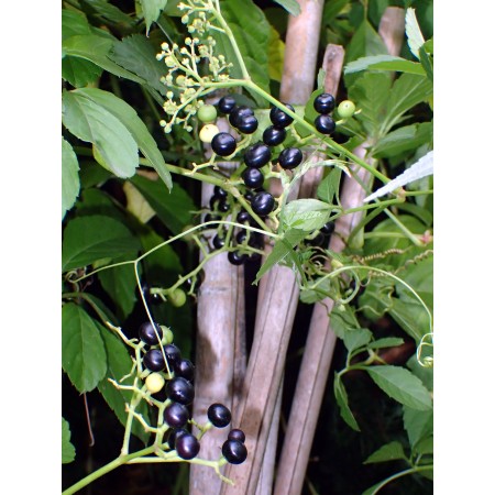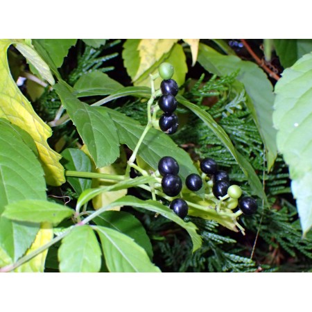 To zielne, dość wysokie, wieloletnie pnącze, dość odporne na mróz (dobrze zimuje w naszym ogrodzie w strefie 6/7 pod okryciem). Jest bardzo ekspansywne i może uśmiercać rośliny rosnące w pobliżu (stąd nazwa angielska "bushkiller"). Młode pędy są jadalne po ugotowaniu i bardzo smaczne. Podobno jadalne są również czarne owoce - używane na przetwory (choć według nas są cierpkie). Rzadkość w Europie w handlu. Nasiona należy wysiać w jesieni w chłodnej piwniczce, lub stratyfikować w wilgotnym piasku w lodówce. Kiełkują wiosną. Pakiet 25 świeżych nasion.