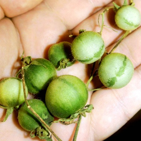 Rzadki owoc – to rozłożyste wieloletnie krzewy lub pnącza do 6 m długości, ale zwykle mniejsze. Kwiaty bardzo efektowne o średnicy 2,5-5 cm, złote. Owoce są jadalne (w Ekwadorze są marynowane z cebulą). Owoce są drobne (około 1-1,5 cm) średnicy, zielone, owłosione (z bardzo delikatnymi prostymi włoskami), pachnące i bardzo smaczne w pełni dojrzałe (o specyficznym owocowym aromacie i smaku). Liście z błyszczącymi górnymi powierzchniami. Gatunki pochodzące z południowo-zachodniej części Ekwadoru na niższych szerokościach geograficznych (0-6 stopni na południe). Ta forma może krzyżować się z pomidorem uprawnym ( Solanum lycopersicon). Roślina odporna na mączniaka prawdziwego, zarazę wczesną, plamistość bakteryjną, nicienie korzeniowe i dwa gatunki przędziorków. Późna, ale wcześniejsza niż druga forma - Lycopersicon hirsutum f. typicum (- dostępne w innych naszych ofertach). Odporny na niskie temperatury. Opakowanie 25 nasion (zebrane z naszego ogródka)