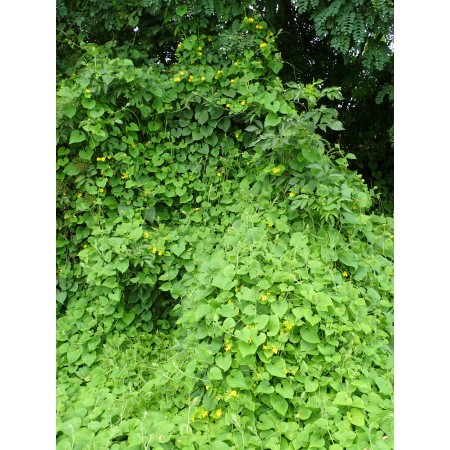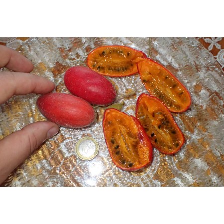 Wieloletnie pnącze dorastające do 6 m długości. Mrozoodporne do strefy 6a. Roślina ta tworzy okrągłe bulwy (podobne do ziemniaków, ale prawdopodobnie jadalne po specjalnej obróbce) oraz smaczne, czerwone owoce (w środku przypominające marakuję), które uważane są za jadalne, gdy są w pełni dojrzałe. Z naszego doświadczenia możemy powiedzieć, że owoce są bardzo smaczne, aromatyczne i bardzo słodkie, ale jadalne w stanie surowym tylko w niewielkich ilościach (bo drażnią gardło podczas jedzenia - prawdopodobnie zawierają rafidy szczawianu wapnia). Długo gotowany miąższ owoców traci drażniące właściwości i jest bardzo smaczny nawet w dużych dawkach. Bardzo ozdobne pnącze - liczne żółte kwiaty i czerwone owoce. Nasiona świeże - zebrane jesienią 2024. Nasiona trudno dostępne w handlu. Bardzo rzadka roślina. Nasiona należy siać powierzchniowo. Utrzymywać wilgotność, ale żeby nie było zbyt mokro. Można użyć środka grzybobójczego do zaprawienia nasion. Do powstania owoców potrzebne są rośliny męskie i żeńskie (z nasion powinny wyrosnąć obie płcie) oraz zapylanie ręczne (ponieważ w swoich kwiatach tworzy tłusty olej, a nie nektar i dlatego pszczoły europejskie czy amerykańskie nie chcą ich zapylać). Opakowanie 25 nasion (zebrane jesienią 2024). Ostrzeżenie: gatunek ten został zgłoszony jako rzadka (ale lokalnie bardzo obficie rosnąca) roślina inwazyjna w niektórych krajach, na przykład w części USA.