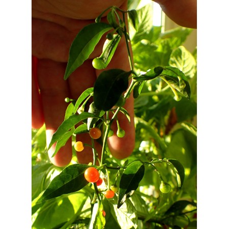 Hardy Chili (Capsicum flexuosum) to liściasty krzew o wysokości około 1-3 m (=3-10 stóp), który wytwarza łagodne ostre (w przypadku moich roślin są one naprawdę dość ostre), bardzo słodkie w smaku, małe (około 7-10 mm), okrągłe, czerwone owoce i czarne nasiona. Ten bardzo rzadki gatunek dzikiej papryki pochodzi z południowej Brazylii i skrajnie północnej części sąsiedniej Argentyny i wschodniego Paragwaju. Jest niesamowicie odporny na zimno i mróz - do około 5-14 stopni F [= (-10)-(-15) stopni C] lub nawet mniej w preferowanych warunkach. Być może krzew ten uda się także w uprawie w otwartym ogrodzie w Polsce, grubo mulczowany - część nadziemna przemarznie, ale powinien odbić od korzeni na wiosnę (jest jednak zastrzeżenie - jeśli ktoś chciałby tego spróbować, nie gwarantujemy sukcesu i polecamy posadzić wiosną w ogrodzie dużą roślinę, taka która już przezimowała co najmniej jedną zimę np. w piwniczce, żeby zdążyła się dobrze zadomowić i rozrosnąć do jesieni i także radzimy mulczować grubo teren koło 1-2m kwadratowych wokół niej. U nas papryczki te zimują w nieogrzewanej szklarni, z okrytymi korzeniami agrowłókniną i kopczykiem z ziemi. Roślina ta jest bardzo trudna do rozmnażania z nasion. Najlepiej stosować hormon - kwas giberelinowy - GA3 (2000 ppm przez 24 godziny) + herbatę rumiankową do namaczania nasion przed siewem (lub przykrywać nasiona chemicznym fungicydem zamiast rumianku). Nasiona kiełkują powoli i nieregularnie (czasami po kilku miesiącach od daty siewu). Należy je wysiewać bardzo płytko w dobrze zdrenowanym lekkim podłożu i utrzymywać stałą wilgotność (czyli np. przykryć doniczkę folią przeźroczystą) i ciepło (można doniczki ustawić na kaloryferze - do czasu gdy pojawią się kiełki, jeśli w domu jest zimno; a potem wziąć na parapet). I trzeba uzbroić się w cierpliwość. Małe sadzonki są bardzo, bardzo podatne na choroby grzybowe. Większe rośliny (powyżej około 10-12 cm = 4-5 cali wysokości) są znacznie bardziej odporne. Później jest to roślina bardzo łatwa w uprawie. Gdy się dobrze zadomowi jest odporna na suszę ale lubi dobrze zdrenowaną glebę. Najlepsza dla niej jest gleba „kaktusowa mieszanka”, jeśli rośliny są uprawiane w doniczkach. Należy je regularnie nawozić. Roślinę można również łatwo rozmnażać wegetatywnie przez półzdrewniałe, zielone sadzonki (najlepiej z tzw. "piętką"), które łatwo ukorzeniają się w doniczkach na słonecznym parapecie (w mieszance dużej ilości piasku i mieszanki gleby torfowej – w proporcji około 1:1). W literaturze często opisuje się, że gatunek ten jest samo-niezgodny, więc aby uzyskać owoce potrzebne są co najmniej 2 różne genetycznie rośliny, ale zauważyłem, że pojedyncza roślina może sporadycznie tworzyć owoce bez zapylenia pyłkiem innej rośliny, na dworze jak i w domu (również bez zapylania przez pszczoły). Ale aby zebrać dobry plon potrzebne są co najmniej 2 różne genetycznie rośliny (powstałe z 2 nasion) i owady (zapylacze). W takim przypadku roślina tworzy bardzo liczne owoce. Roślina ta bywa wykorzystywana do krzyżowania z innymi papryczkami chili. Posiada bardzo cenne geny „odporności na mróz”. Liczba chromosomów C. flexuosum jest taka sama jak uprawianych gatunków papryczek chili (2n = 24). Być może w przyszłości dzięki jej genom powstaną odporne na mróz, duże owocowe papryczki chili? Rzadkość. Opakowanie 30 świeżych nasion. Nasiona zebrane jesienią 2025 r i przechowywane w odpowiednich warunkach.
